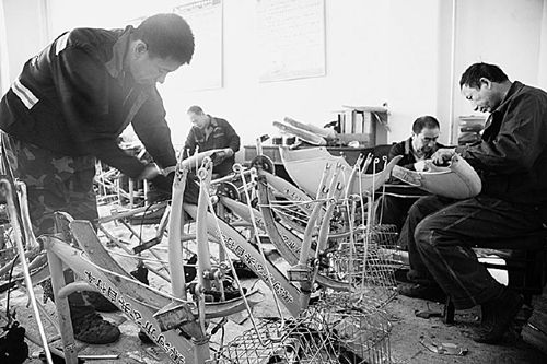 工作人員取掉各網(wǎng)點防護罩并為控制器安裝電瓶進行調(diào)試維修人正在對自行車進行檢修