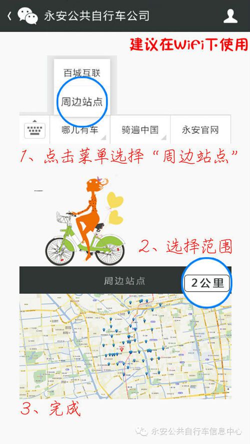 為方便廣大市民更好的使用公共自行車,我司特推出永安公共自行車微信官方服務(wù)號(hào),關(guān)注“永安公共自行車公司”或者“ibike668”,點(diǎn)擊“哪兒有車”,再點(diǎn)“周邊站點(diǎn)”,即能找出您附近所有公共自行車站點(diǎn)。