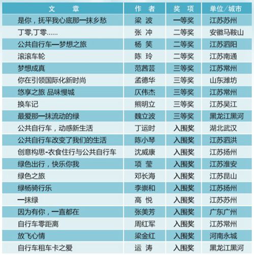 2014年5月底,常州永安公共自行車系統(tǒng)股份有限公司發(fā)布了“衣食住行與公共自行車”有獎?wù)魑拇筚?,征稿時間僅短短兩個月,社會各界和公司上下熱烈響應(yīng),踴躍投稿。截止至7月底,我們一共收到征文投稿70多篇,有歌頌綠色出行的篇章,有弘揚(yáng)低碳環(huán)保的詩文,有仰望永安夢想之旅的贊歌。經(jīng)過初步篩選,根據(jù)征文大賽的評選要求,邀請專業(yè)評委組進(jìn)行最終評審,評選出一等獎1名,二等獎3名,三等獎5名,入圍獎11名?,F(xiàn)予以公布,詳見附圖。