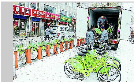 文/本報記者魏立波 攝/本報記者張輝 工作人員正在將各網(wǎng)點的自行車裝車入庫