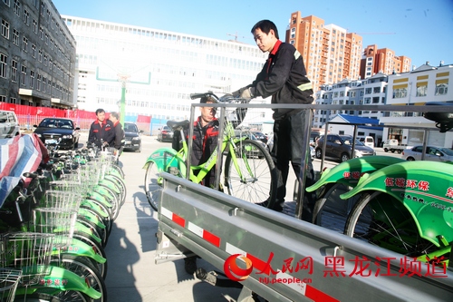 黑河市公共自行車管理中心工作人員開始將已檢修完畢的公共便民自行車啟運出庫。