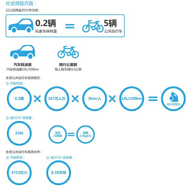 而從社會(huì)效益方面來(lái)看,江浙兩省2015年的人均私家汽車(chē)保有量為0.2輛;以每5人騎公共自行車(chē)代替1輛小汽車(chē)出行為例,按照每人每天騎行3公里;小汽車(chē)百公里10升耗油量計(jì)算,則永安公共自行車(chē)系統(tǒng)每天為全社會(huì)節(jié)省燃油10.02萬(wàn)升(0.2×167萬(wàn)人次×3公里/人次×10升/100公里),相當(dāng)于每天減少二氧化碳排放230噸(節(jié)約1升燃油=減排2.3千克二氧化碳)。永安公共自行車(chē)系統(tǒng)全年為全社會(huì)節(jié)省燃油3723萬(wàn)升汽油,相當(dāng)于減少8.39萬(wàn)噸的二氧化碳排放。