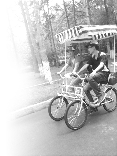 在黑龍江森林植物園的自行車租賃點(diǎn),有200多輛不同款式的自行車擺在停車場(chǎng)。普通雙人騎自行車、豪華3人親子騎自行車、情侶首選豪華雙人并排騎自行車、豪華4人騎自行車等,價(jià)格從每小時(shí)30元到100元不等。