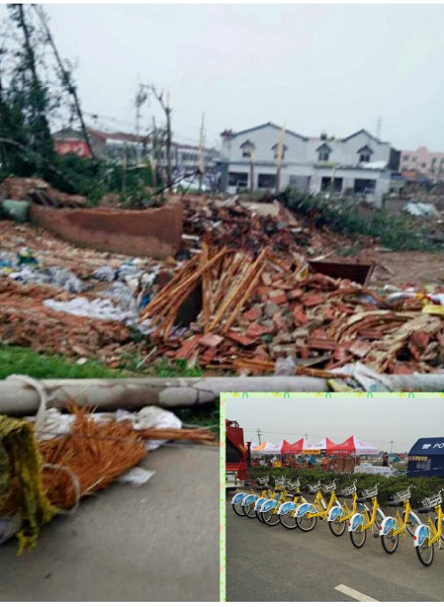 將物資送到災(zāi)區(qū)現(xiàn)場得知,由于受災(zāi)的都是鄉(xiāng)村,村里的小路本來就崎嶇不平、坑坑洼洼,再加上這次龍卷風(fēng)、冰雹的襲擊,現(xiàn)場一片狼藉,很多車輛都無法進(jìn)入。鹽城公共自行車中心及監(jiān)管單位得知情況后,立即決定調(diào)出100輛公共自行車運(yùn)往災(zāi)區(qū),分發(fā)到各個(gè)民警值班點(diǎn),由民警統(tǒng)一調(diào)配使用。民警高興地說:太好了,有了公共自行車我們?nèi)ゴ迕窦揖头奖愣嗔?,你們想得太周到了!是啊,天?zāi)無情人有情,愛心無疆渡難關(guān),大家都通過各自的方式伸出援助之手,愿這一抹黃色,給災(zāi)區(qū)同胞帶去溫暖,帶來力量!