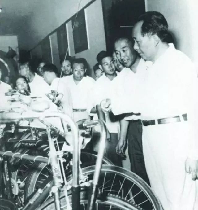 1958年8月毛澤東主席參觀飛鴿牌自行車。