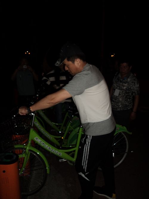 央視著名主持人畢福劍在黑河與公共自行車員工合影及試騎自行車
