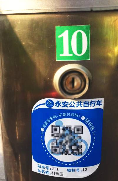 5、路人君在距離自己最近的一個(gè)站點(diǎn)上,發(fā)現(xiàn)每一個(gè)停車樁上都貼上了一個(gè)二維碼。