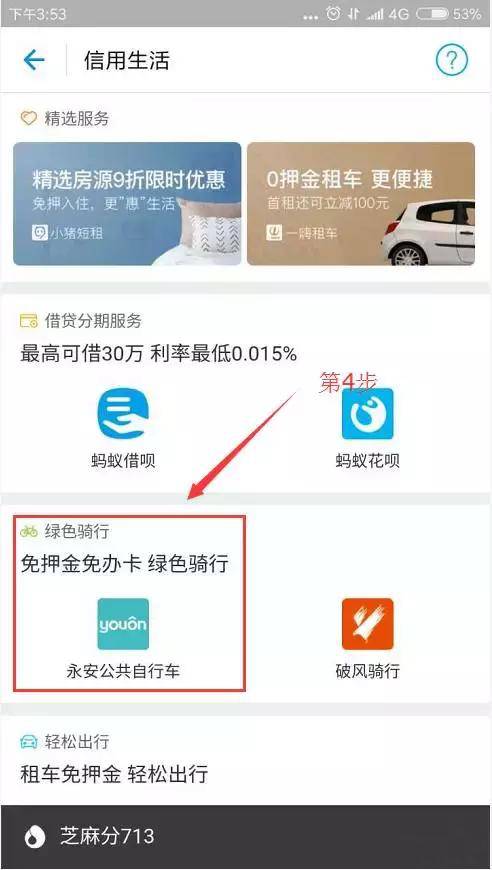 4、永安公共自行車,就是我們現(xiàn)在在用的公共自行車,相比于傳統(tǒng)的刷卡租車,用支付寶掃碼,可以看到多了很多功能。