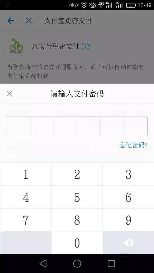 會(huì)出現(xiàn)一個(gè)設(shè)置支付密碼的界面。這是為了確保超過1小時(shí)后,公共自行車向支付寶發(fā)起自動(dòng)扣費(fèi)。正常填寫就好。