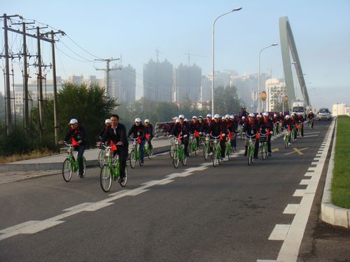 黑河市公共自行車全體員工為迎接第五屆“世界無車環(huán)保日”舉行騎行活動(dòng)。倡導(dǎo)市民“綠色出行,低碳生活,美化城市,改善交通”。