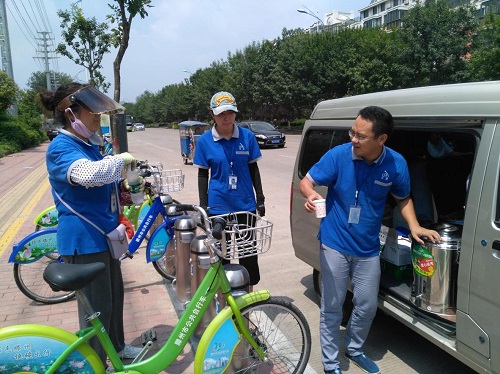 在7月27日下午最熱的時(shí)間段,漣水公共自行車管理中心負(fù)責(zé)人前往站點(diǎn),為那些堅(jiān)守在一線的巡檢師傅們送上一片清涼。