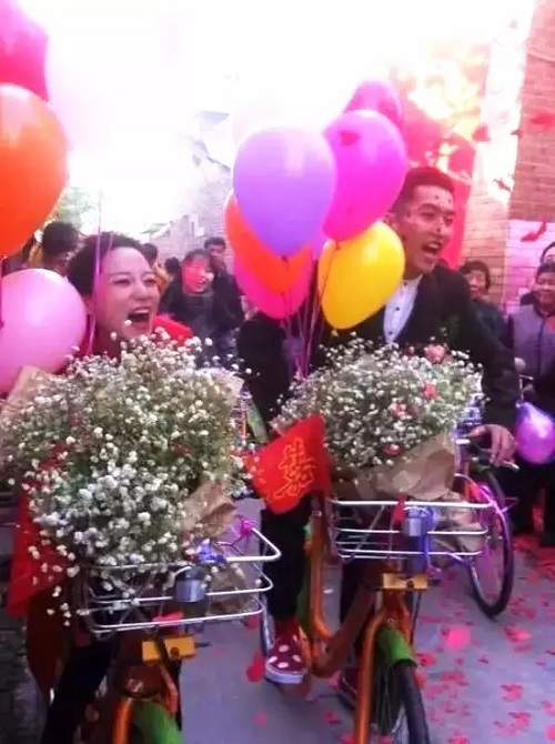 鮮花飄香,氣球傳情。當(dāng)天中午,一對新人滿面笑容,腳穿同種款式的紅色板鞋,騎著五彩繽紛的城市公共自行車穿行于大街小巷,親朋好友同樣騎車陪伴左右,一路歡聲笑語,幸福滿滿。