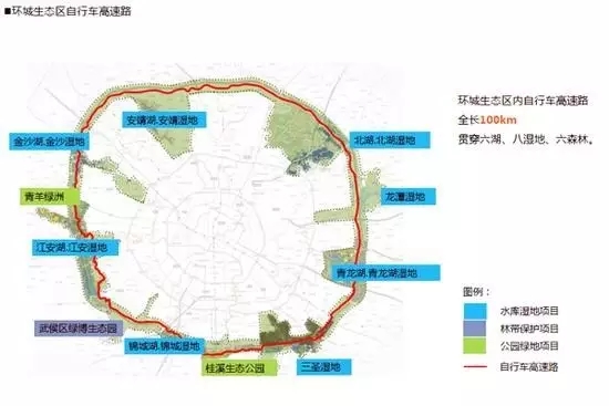 自行車高速公路。根據(jù)規(guī)劃,自行車高速公路總長(zhǎng)約100公里,寬度為6米,雙向通行,將貫穿六湖、八濕地、六森林,設(shè)計(jì)騎車速度可達(dá)60公里/每小時(shí)。